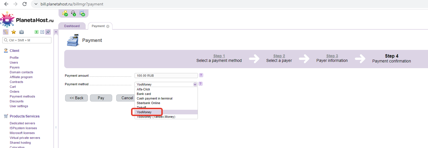 You need to choose a payment method and indicate the amount you would like to top up your account. We choose the payment method YooKassa (LLC "PLANETAHOST") and indicate the amount of replenishment of the account: